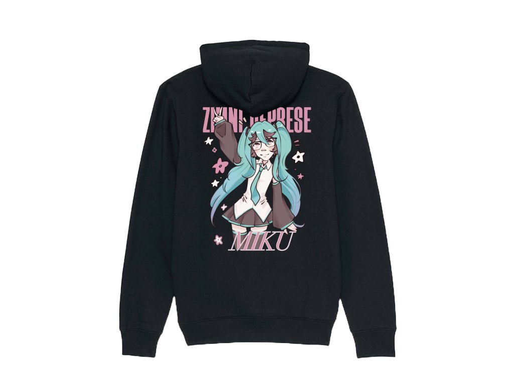 Černá mikina s kapucí, stahovací šňůrkou a kapsou. U dětské velikosti bez šňůrky. Materiál: 80% bavlna, 20% polyester.